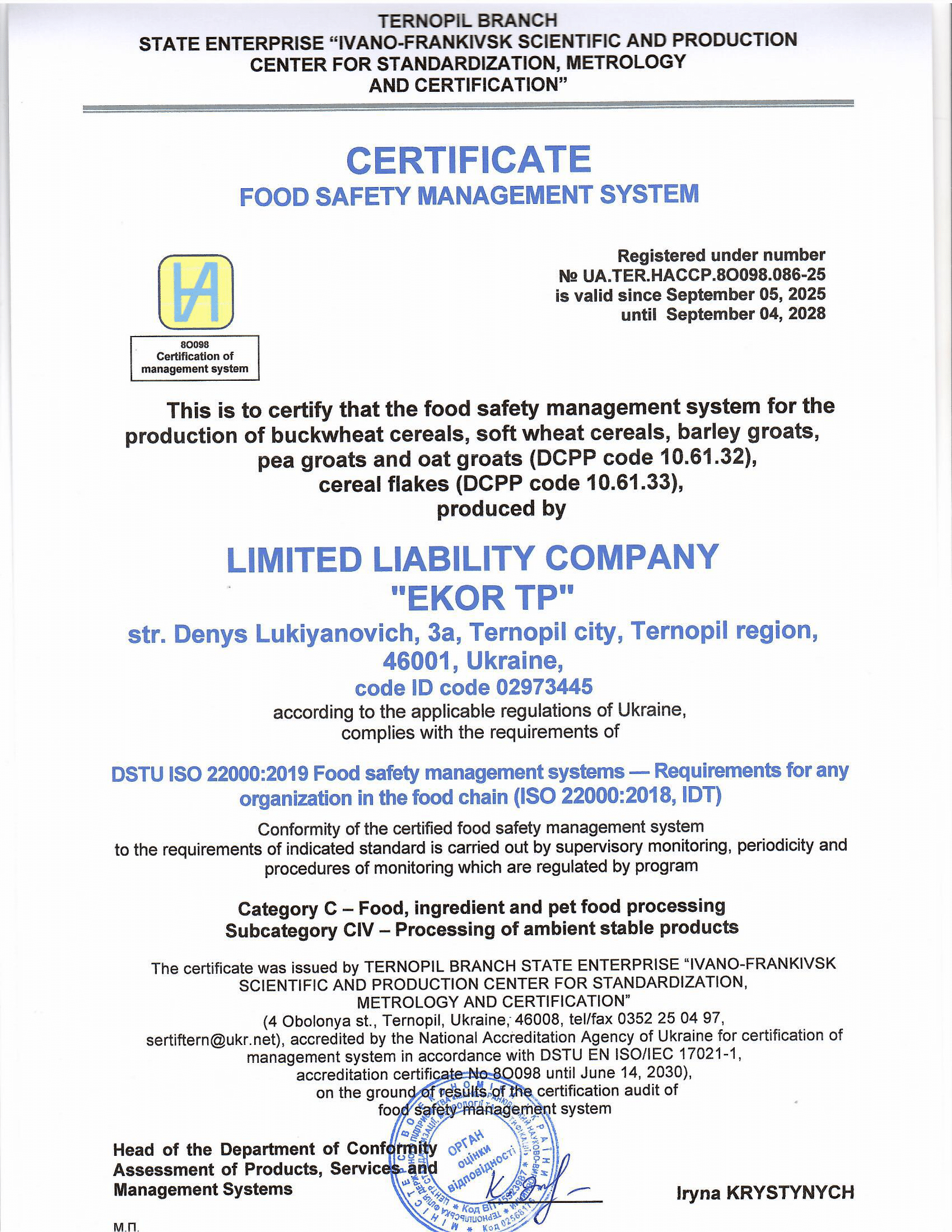 Асортимент готової продукції відповідає вимогам нормативної документації ДСТУ Національних стандартів України.